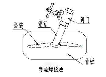 適用于泄漏面積較大或流量較大或壓力較大時的焊接,根據泄漏處的的形狀制作一塊帶截流裝置的補板。泄漏較為嚴重時,截流裝置用一段導流的管子,在上面裝一個閥門,泄漏較小時,補板上預留一個螺絲帽即可。補板的面積一定要大于泄漏處,截流裝置在補板上的位置一定要正對著泄漏處,補板與泄漏處接觸的一面涂上一圈密封膠,讓泄漏的介質從導流管流出,以減少補板周圍的泄漏。補板焊好后,關閉閥門或擰緊螺栓即可。