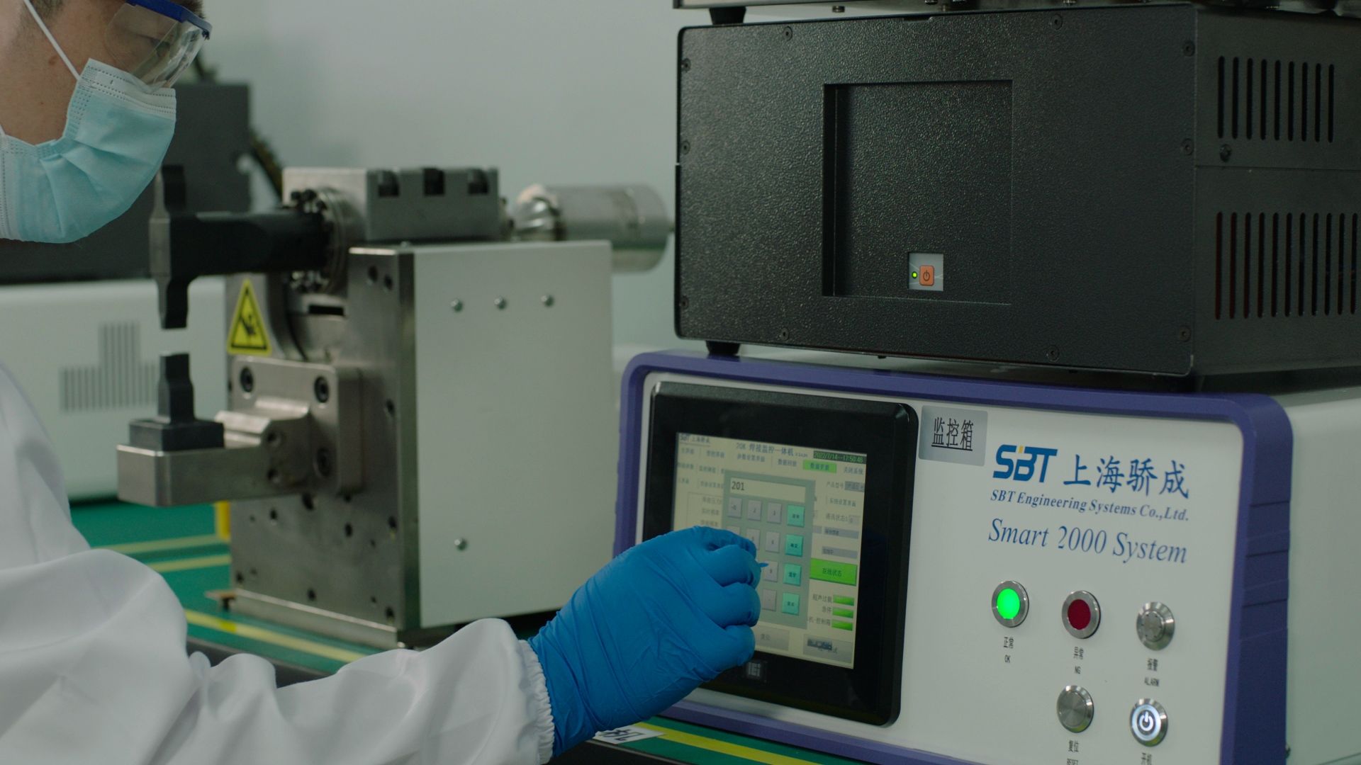 圖注:技術(shù)人員在使用驕成超聲焊接在線監(jiān)控設(shè)備
